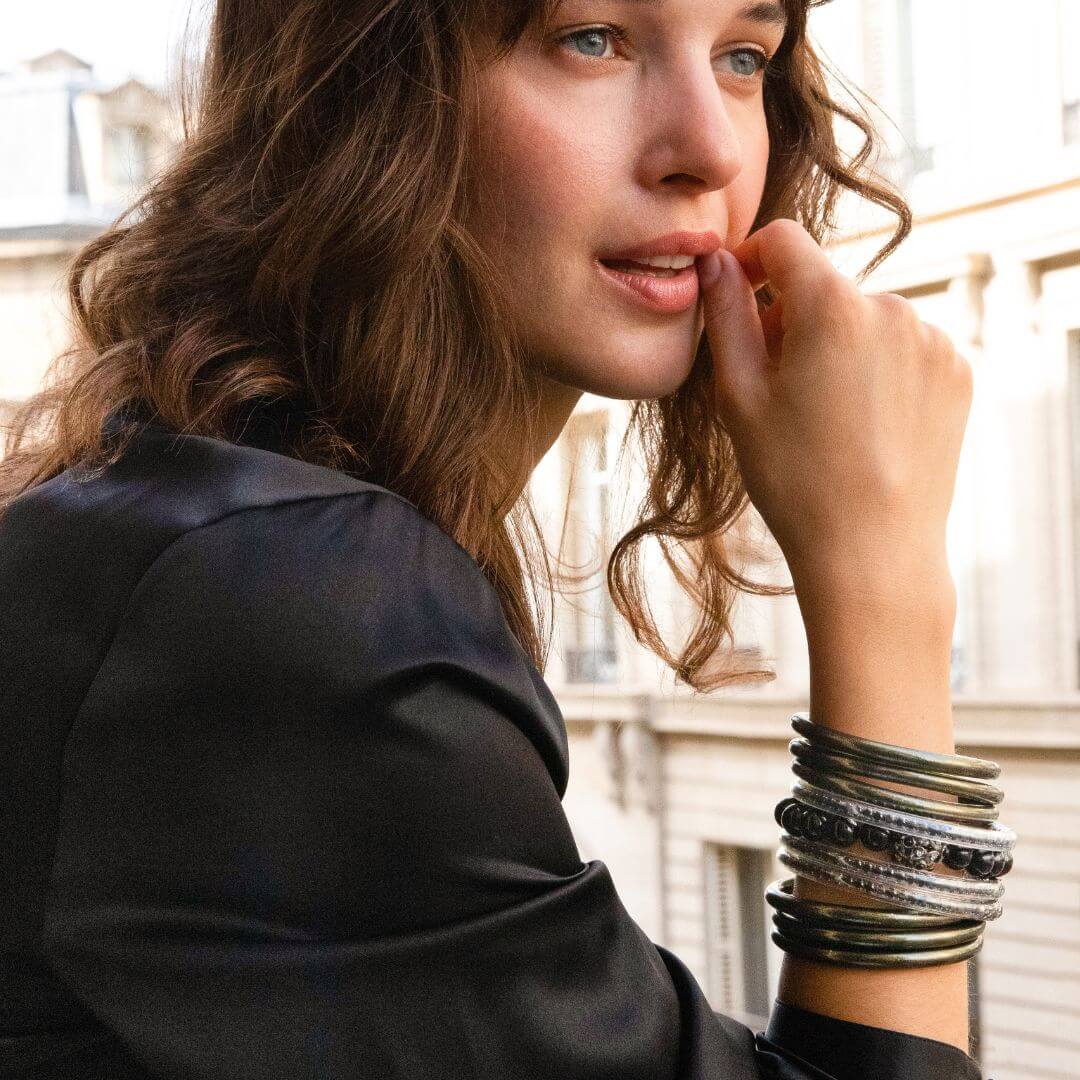 Es heißt, dass unsere Black Spinel Three Queens All Weather Bangles® Sie dazu einladen, eine wunderschöne Handgelenkslandschaft™ zu schaffen, die Sie zur Ruhe führt und erdende Schwingungsenergie ausstrahlt.