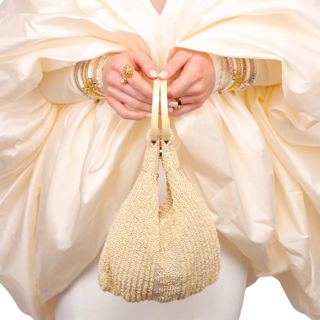 Voici le sac Elsa, un sac à main incarnant les qualités des femmes remarquables qui nous inspirent. Avec son essence angélique, ce chef-d'œuvre perlé couleur ivoire est méticuleusement conçu, chaque perle étant cousue à la main pour créer une texture étonnante et élaborée qui demande l'attention.