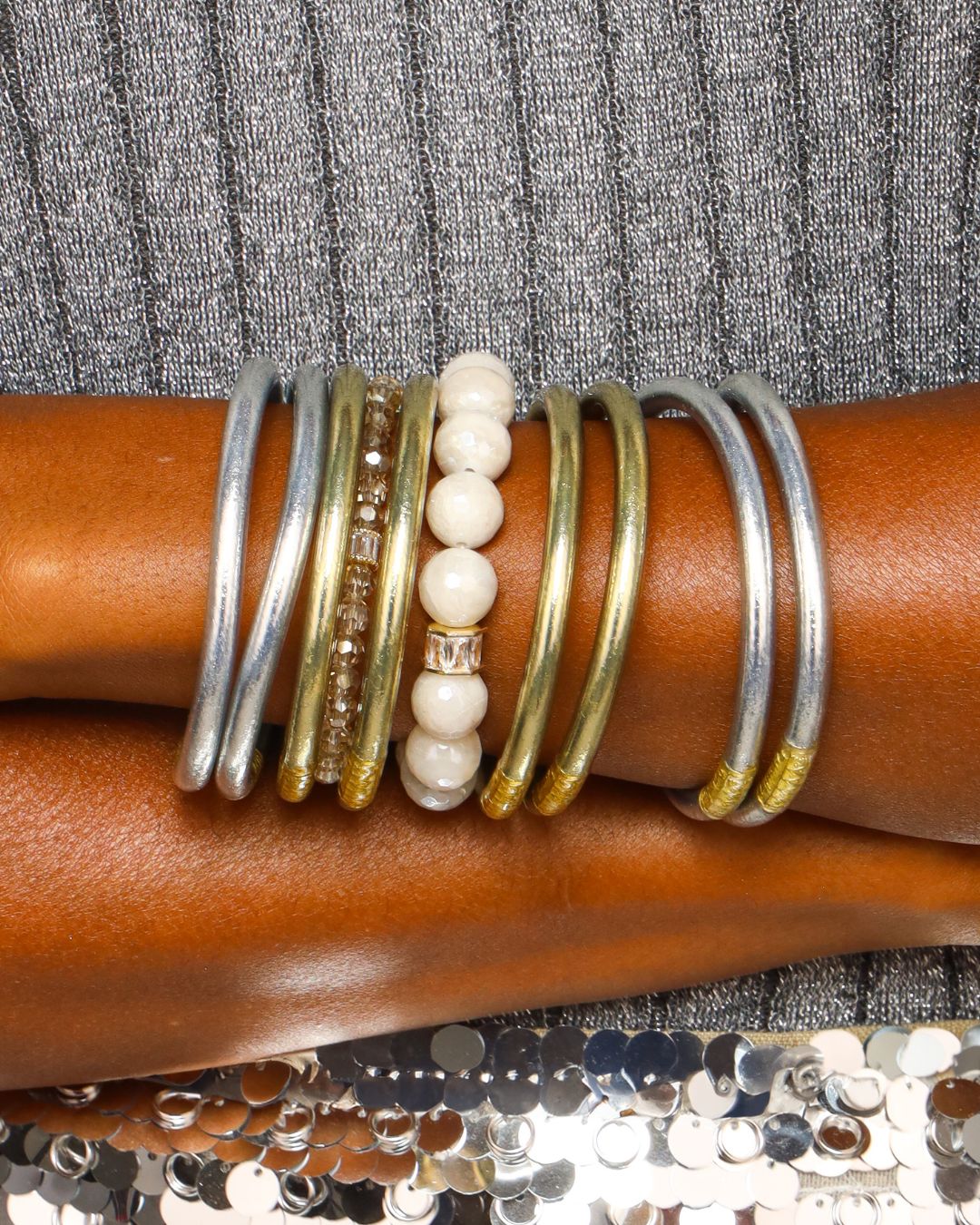 BuDhaGirl is all about wristscapes™ and exquisite bangle stacks. Now, with Etoile on your wrist, you will luxuriate in graceful elegance, the six bangles are simply perfect on their own. Etoile combines beautifully with our classic gold, is fantastic with silver, and incredible with Flint, Lila, Flame, and Marine.