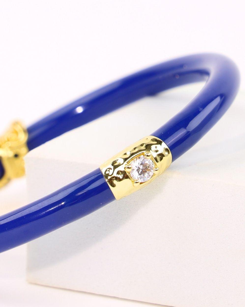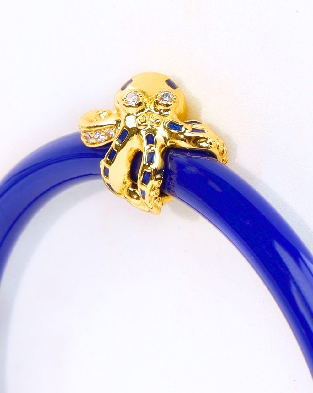 Crafted in our fine jewelry workrooms in Bangkok, the octopus is made from gold-plated, nickel-free brass, with a body that is highlighted in rich lapis enamel—an oceanic blue that evokes ancient seas and midnight depths. Clear crystals glimmer as eyes, adding a hypnotic sparkle to this secretive sea dweller. The octopus wraps gracefully around our beautiful all weather tubing, its delicate tentacles suggesting both protection and power.