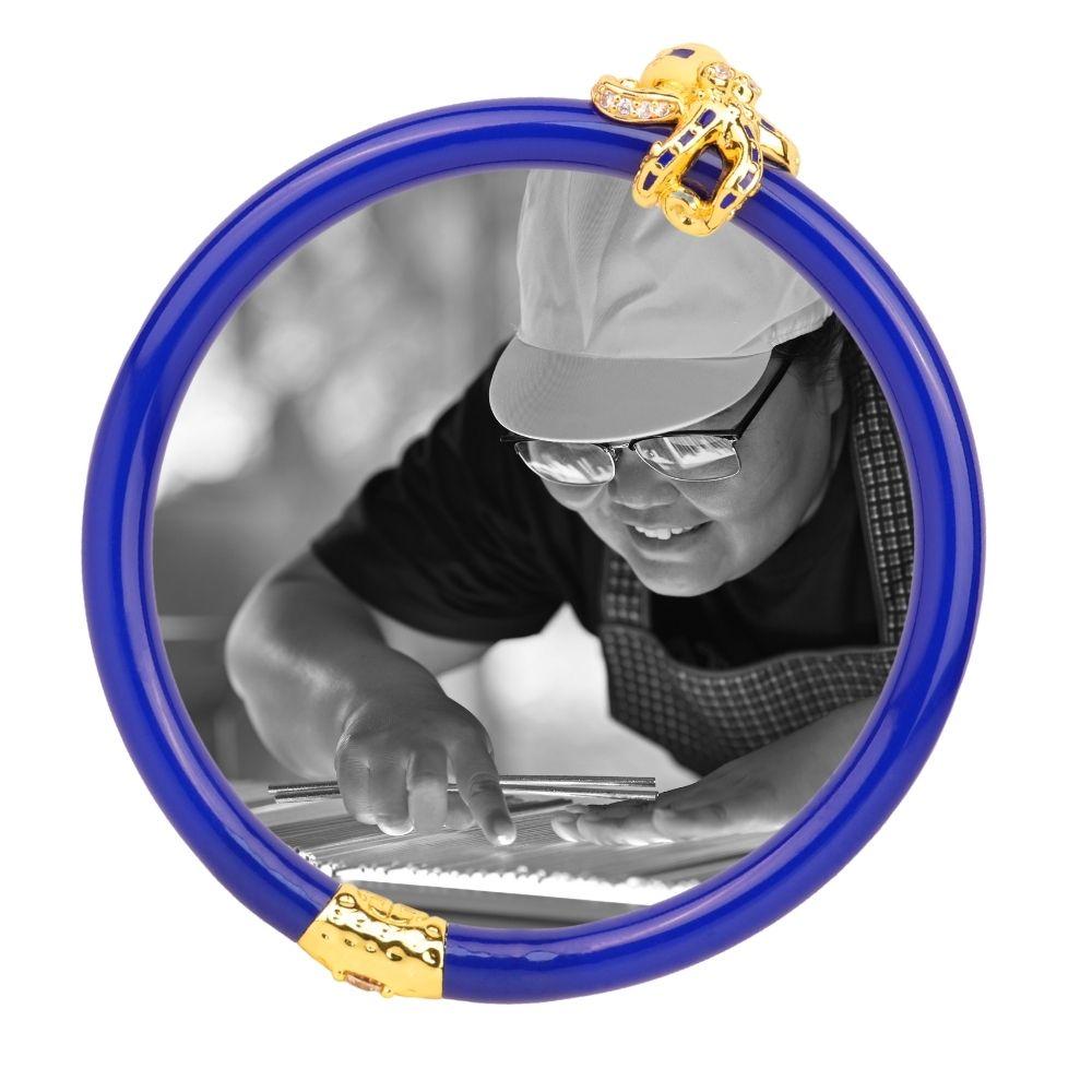 The main visionary artisan behind this bangle is Pukki, whose meticulous craftsmanship brings this piece to life. Handcrafted in Bangkok, each bangle is a testament to artistry and tradition, blending modern design with timeless techniques. Made with care, it reflects the skill and dedication of its maker, ensuring a piece that is as meaningful as it is beautiful.