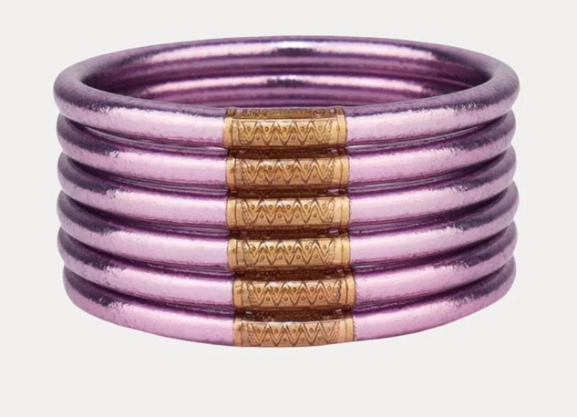 Constructed from flexible polyvinyl carbonate rings infused with delicate gold leaf in a wild lilac tube, then sealed with the our BuDhaGirl Serenity Prayer bead, our Lila All Weather Bangles® embody versatility. From poolside to boardroom to airport, these bangles stay put, allowing you to navigate any terrain without removal. Encased in a custom BuDhaGirl All Weather Bangles silk pouch, each bangle is a testament to meticulous craftsmanship by artisans (over 20 artisans work on each bangle) in Thailand.