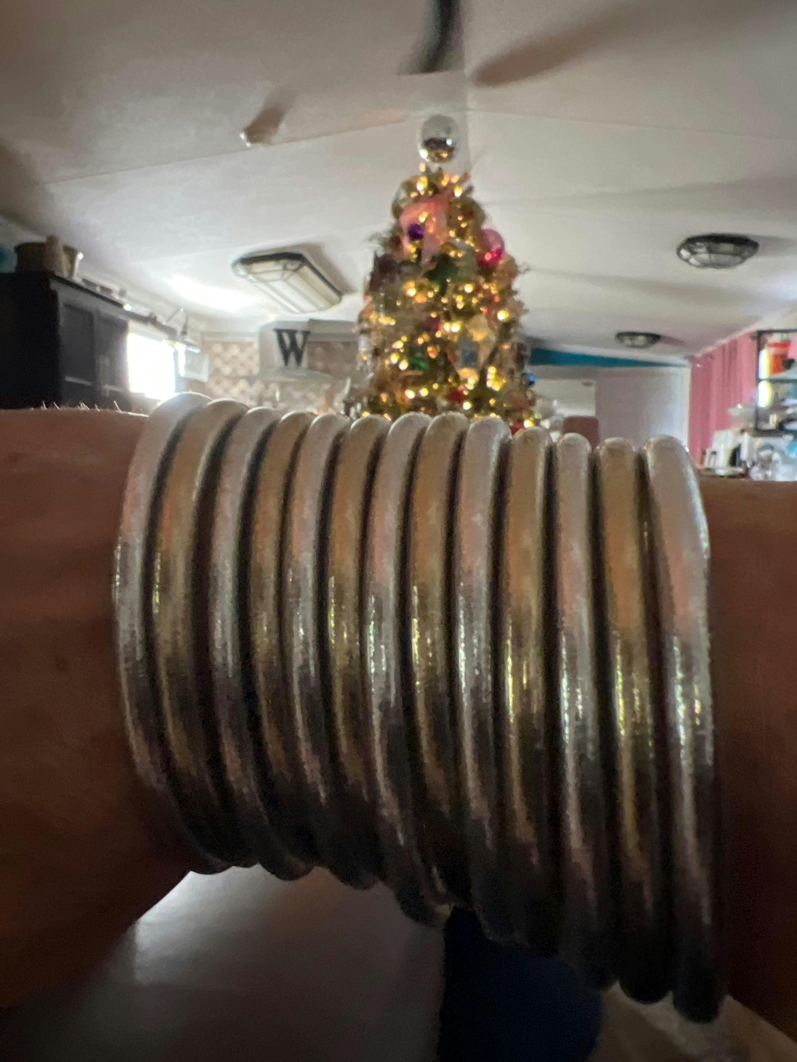 BuDhaGirl Silver All Weather Bangles® (AWB®), are the epitome of cool luxury in BuDhaGirl's impressive lifestyle collection. Our remarkable bangles redefine elegance with their weightless, soundless, waterproof, and TSA-proof design. Crafted to perfection, each set comprises six bangles, symbolizing intentions for the day. Wear them anywhere, as their soundless and waterproof nature ensures seamless integration into any setting.